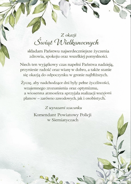 Komendant Wojewódzki Policji w Białymstoku nadinspektor Kamil Borkowski w imieniu własnym oraz kierownictwa podlaskiego garnizonu zwraca się do policjantów, policjantek, pracowników Policji, emerytów i rencistów policyjnych oraz przedstawicieli związków zawodowych, przekazując życzenia z okazji Świąt Wielkanocnych.